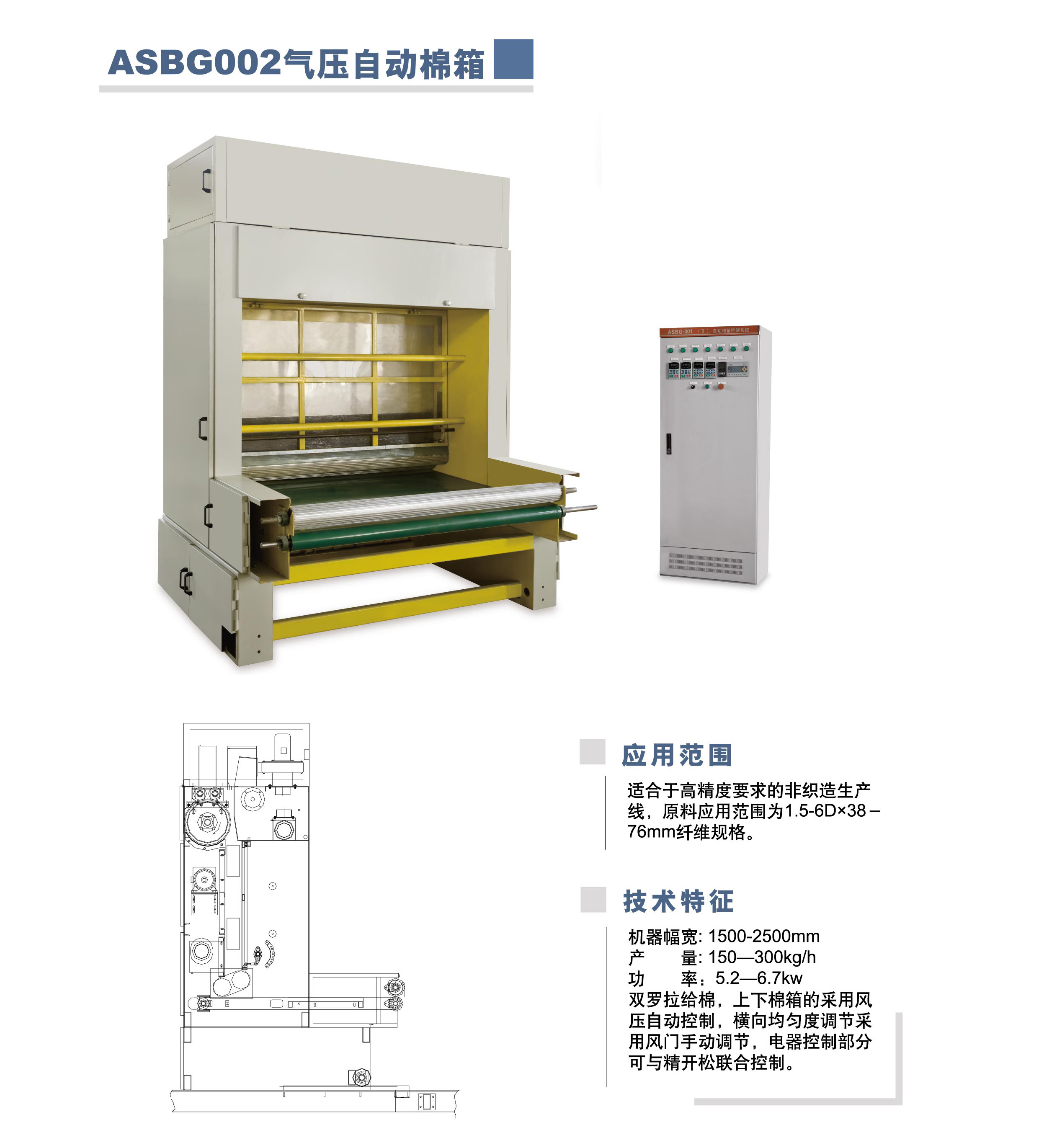 本机是国内较先进的喂棉机构,置于开松机的后面,借输棉风机的作用,将充分开松的纤维均匀充填到本机上棉箱,有压力传感器控制上棉箱的棉位。
